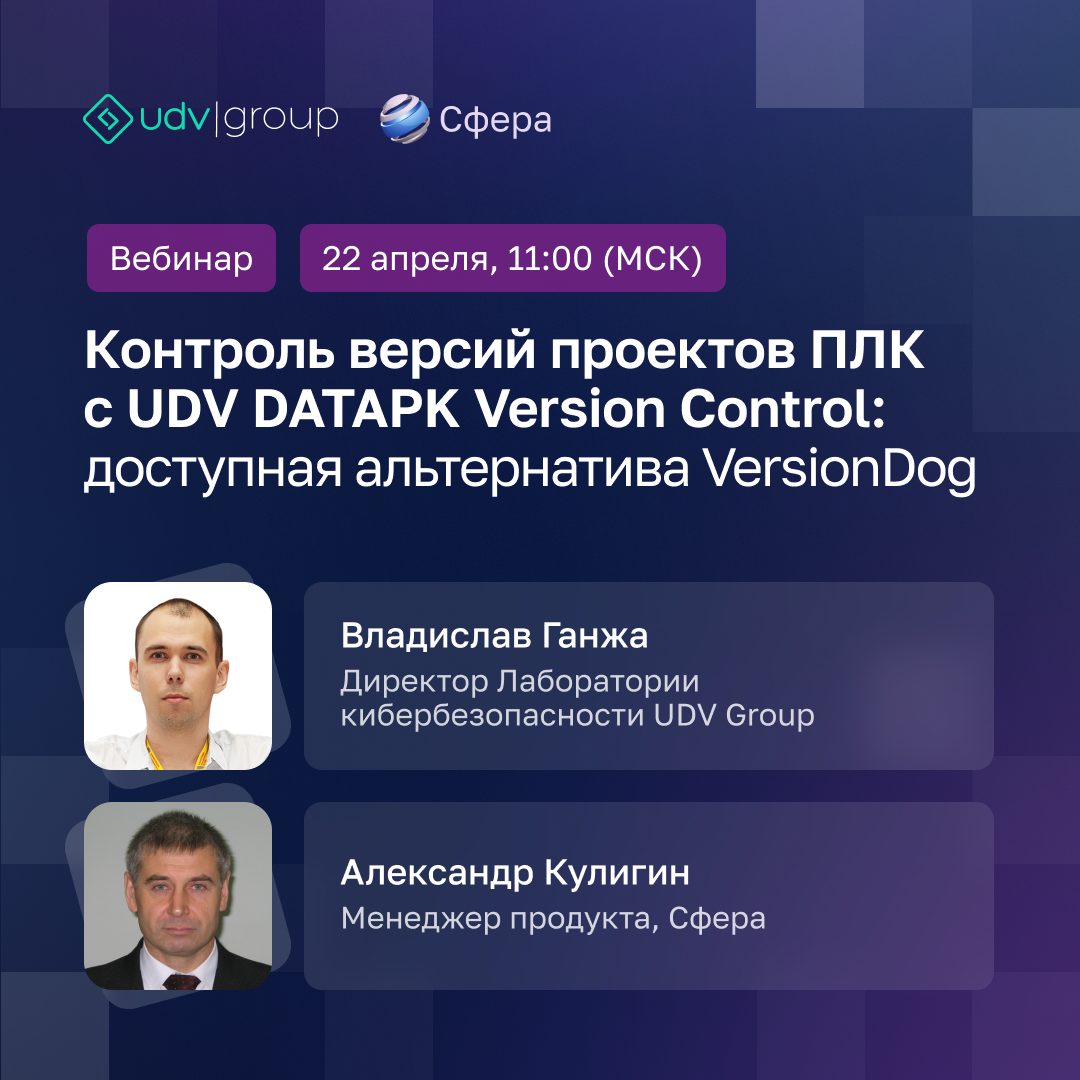 На вебинаре 22 апреля эксперты компаний UDV Group и Сфера расскажут о единственном российском решении для централизованного хранения проектов ПЛК и отслеживания изменений в них — UDV DATAPK Version Control.