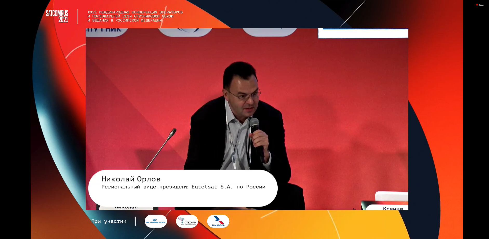 Региональный вице-президент Eutelsat S.A. по России Николай Орлов, анализируя услуги, обусловливающие рост в космической отрасли, указал на увеличение сектора связи подвижных объектов (морские суда, самолеты, поезда): «Eutelsat всегда был в числе технологически продвинутых операторов – мы одними из первых начали использовать новую технологию полностью электрических спутников, выступили инициатором создания программно-определяемых аппаратов связи, первыми применили технологию VHTS». Оппонируя Алексею Волину, Николай Орлов заявил о том, что в ближайшем будущем ожидается существенное снижение стоимости аппаратов с гибкой полезной нагрузкой. Большое внимание докладчик уделил инвестициям в проект OneWeb, в котором доля Eutelsat составляет 23%. Николай Орлов считает, что сегодняшний OneWeb, уже прошедший банкротство и трансформацию, обладает убедительным экономическим потенциалом: «Дальнейшее развитие группировки OneWeb будет вестись компанией Eutelsat».