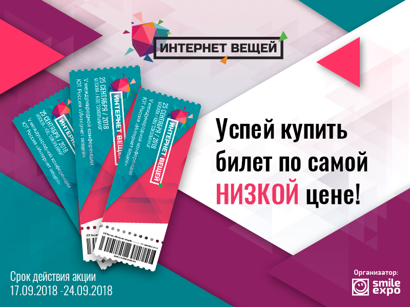 Уже на следующей неделе, 25 сентября, компания Smile-Expo проведёт в Москве V международный форум «Интернет вещей». Организаторы подготовили специальное предложение для желающих посетить ивент: при покупке от двух билетов, стоимость каждого снижается в три раза!