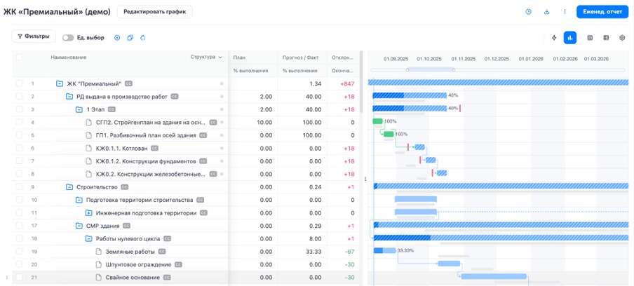 Технические заказчики онлайн контролируют динамику строительства всех объектов. Генеральные подрядчики могут повысить управляемость проектов и снизить риски срывов сроков. Руководители проектов получают доступ к аналитике для принятия обоснованных управленческих решений и координации всех участников строительства. Планировщики могут автоматизировать процессы планирования и снизить количество рутинных операций.