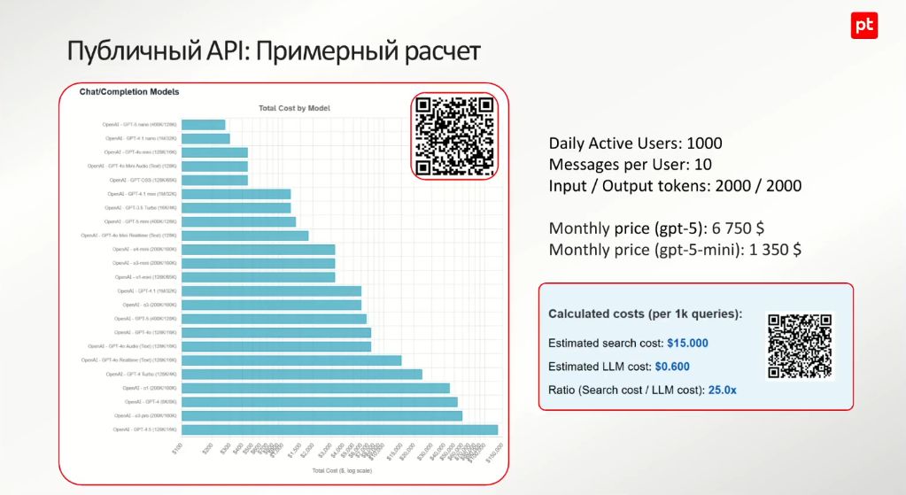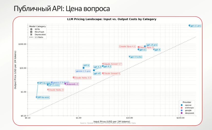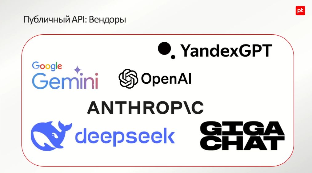 При этом оба подхода имеют право на существование. Публичному API стоит отдать предпочтение в случаях прототипирования и проверки гипотез (например, надо проверить, сможет ли самая умная LLM решить конкретную задачу качественно), готовности продолжительно сотрудничать с провайдером либо когда данные не настолько чувствительны, что их можно отправлять третьему лицу.
