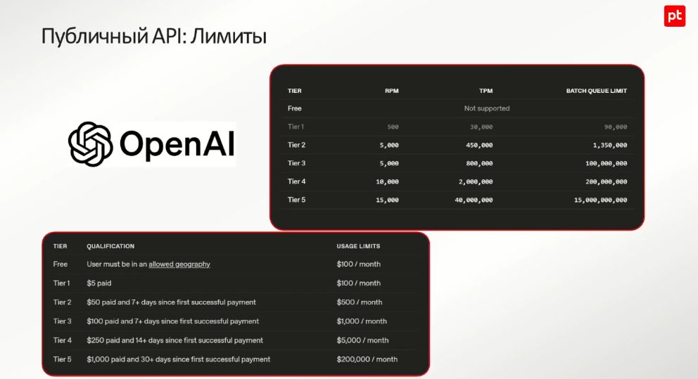 Поскольку LLM требует больших объемов «железа» для своей производительности, то очевидное ограничение – лимиты по использованию API. Обычно вендоры устанавливают лимиты в виде числа запросов, которые пользователь может отправить в минуту, и количества токенов. Правда, олитики вендоров различаются. Чем больше пользоваться API, чаще пополнять счет и оставаться лояльным клиентом как можно дольше, тем шире возможности и выше уровень.
