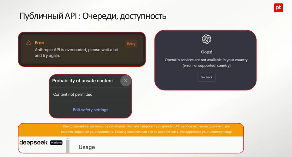 Как известно, любой провайдер не застрахован от непредвиденных обстоятельств. Например, у deepseek на старте одной из моделей пришлось отключить пополнение счета – вендор не рассчитал наплыв пользователей. Модель не выдержала количества запросов и не отвечала очень долго. На Input-токены тратились деньги со счета, Output-токены не возвращались, поэтому вендор был вынужден отключить опцию пополнения счета.