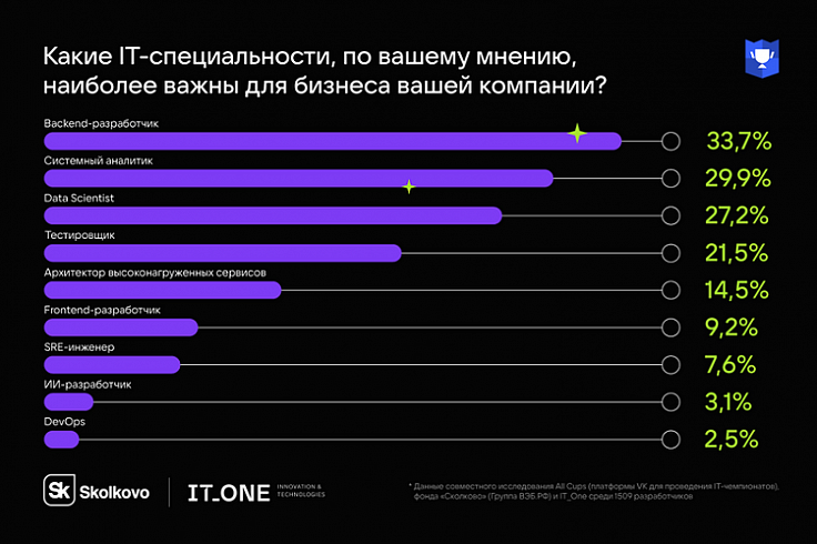 Фонд «Сколково» сообщил, что отечественные разработчики назвали самые «влиятельные» IT-специальности по их мнению. Опрос проходил в марте и собрал мнения 1509 специалистов.