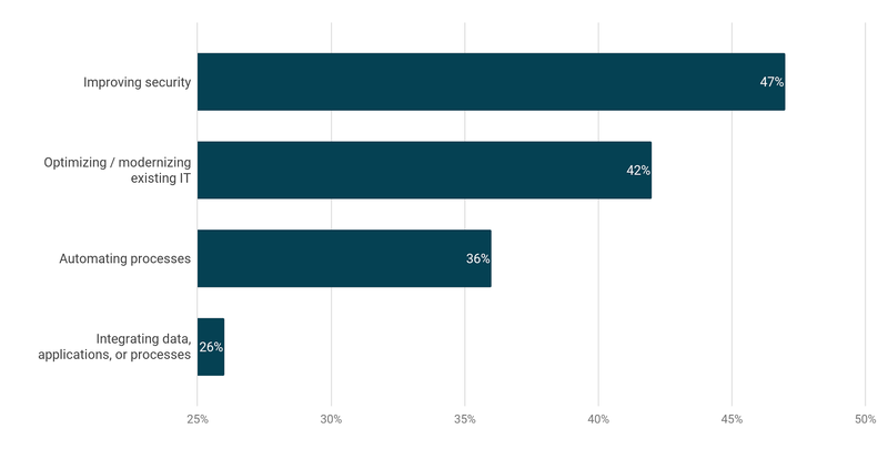Модернизация имеющихся ИТ-систем для многих по-прежнему остается главной задачей (и приоритетом). Если в 2017 году большинство организаций были полны решимости взяться за цифровую трансформацию, то сейчас для многих респондентов (42 % опрошенных) одной из главных задач является оптимизация и модернизация имеющихся ИТ-систем. Помимо нее в топ задач также вошли: повышение безопасности (47 %), автоматизация процессов (36 %) и интеграция приложений, данных и процессов (26 %). Кроме того, 31% опрошенных назвали модернизацию ИТ-систем главным направлением расходов.