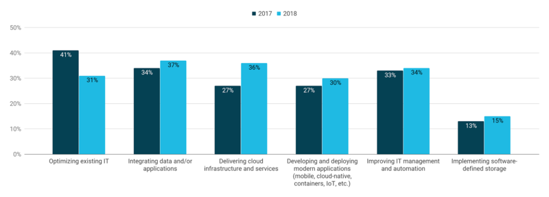 Смещение фокуса ИТ-расходов. Если в 2017 году большая их часть шла на оптимизацию имеющихся ИТ-систем и ресурсов, то в этом году респонденты планируют направить бюджет в первую очередь на организацию облачных инфраструктур и сервисов (36 %), интеграцию приложений и данных (76 %) и разработку и развертывание современных приложений (30 %).