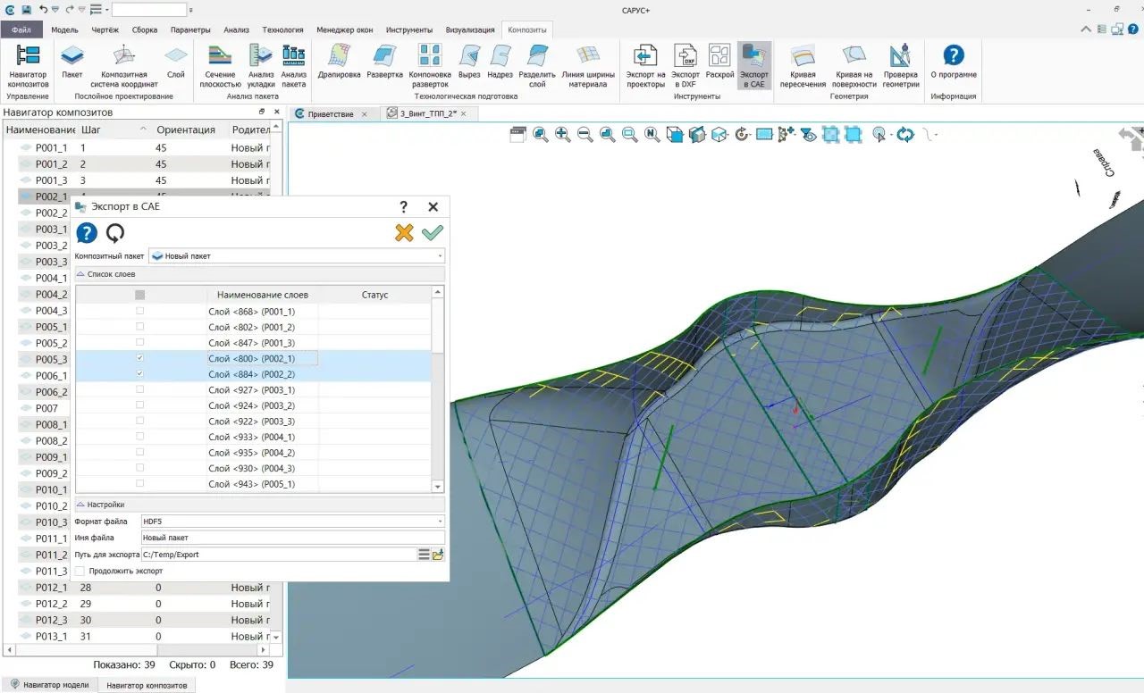 Передача исходных данных выполнена с использованием специализированного формата Composite H5 в обновленной спецификации. Формат позволяет передавать данные как в основные западные CAE-системы, так и в отечественные программные решения.