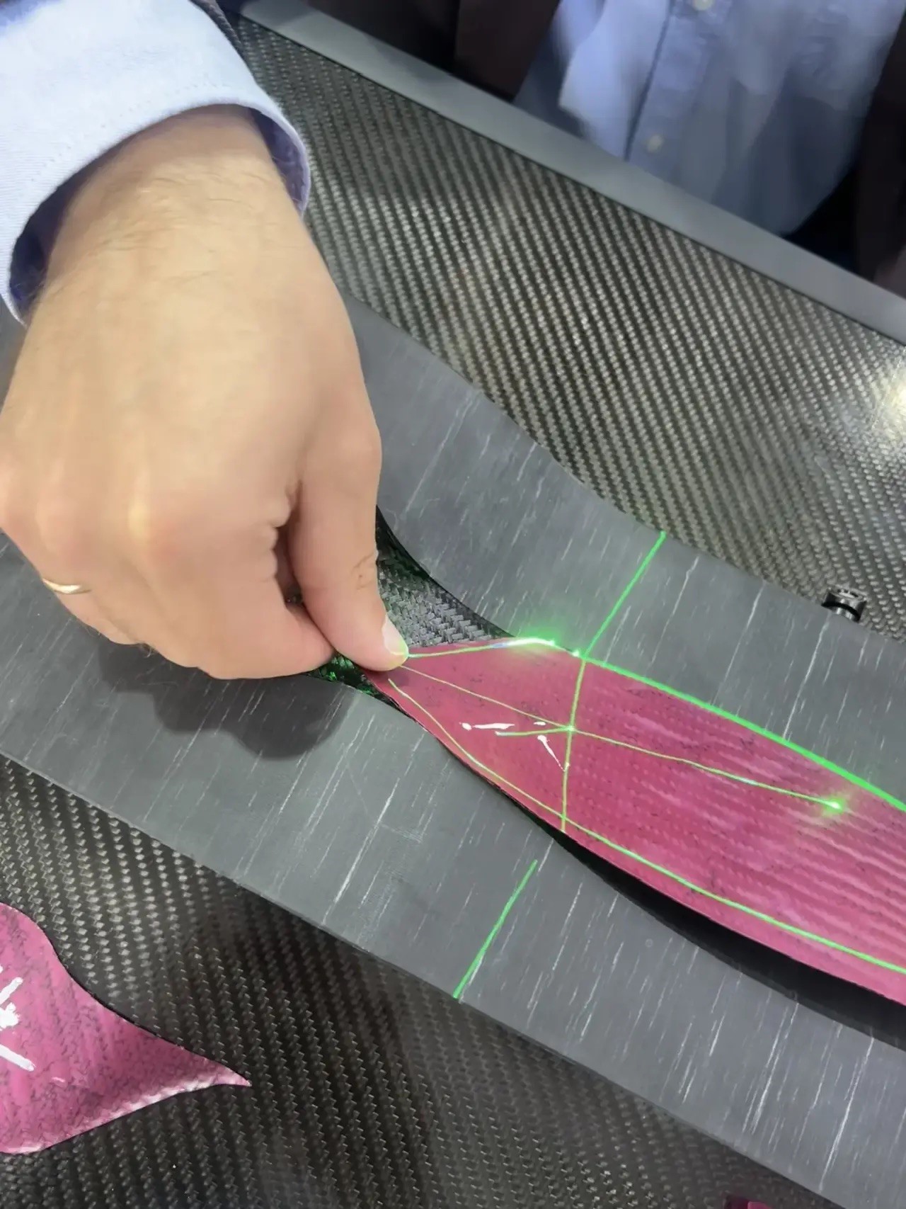 Подготовленные в САРУС+ Композиты технологические данные переданы на раскройное оборудование АТЛАС, с помощью которого выполнен раскрой препрега (развертки). Данные также переданы на лазерные проекторы МАЯК, помогающие повысить эффективность и точность сборки пакета за счет проецирования контура слоя точки начала укладки и направления укладки на криволинейную поверхность оснастки. Плоттеры АТЛАС и проекторы МАЯК отечественного производства поставляются компанией «НЕВА Технолоджи».