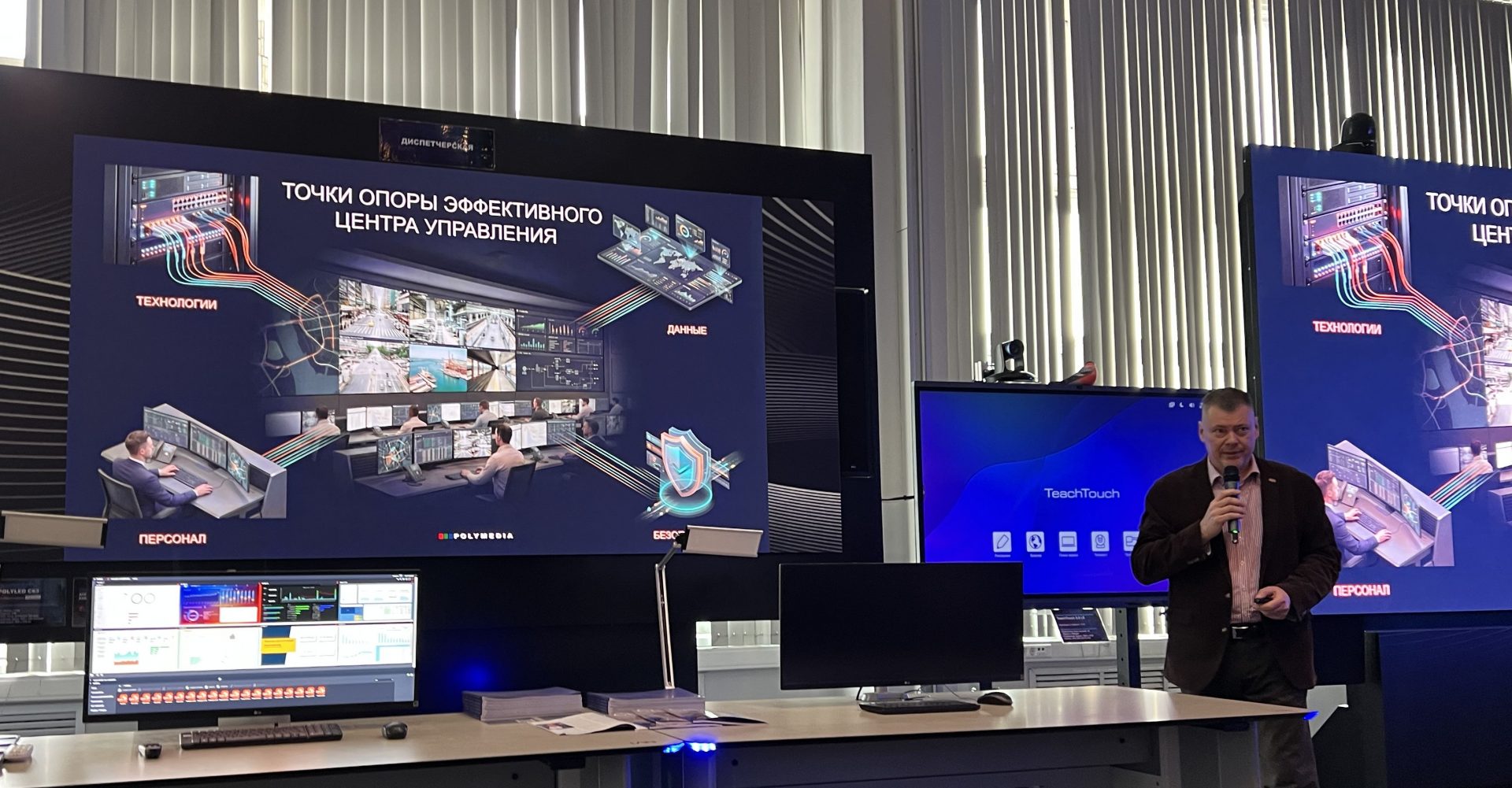 В конце выступления технический директор представил два подхода к созданию центра управления и ситуационного центра. Первый подход предусматривает интеграцию интерфейсов разрозненных информационных систем на единой видеостене. Каждая служба использует свое специализированное ИТ-решение. Информация по всем направлениям мониторинга и управления интегрируется на едином экране большой информационной емкости – видеостене.