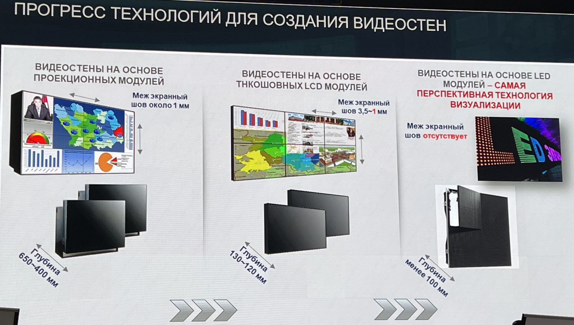 Производители такой продукции сменили фокус с технических характеристик на системную интеграцию, простоту обслуживания и снижение совокупной стоимости владения. В презентации Игорь Ишеев проследил эволюцию развития технологий для создания видеостен (от проекционных, тонкошовных LCD- до LED-модулей, благодаря которым межэкранный шов ушел в прошлое).