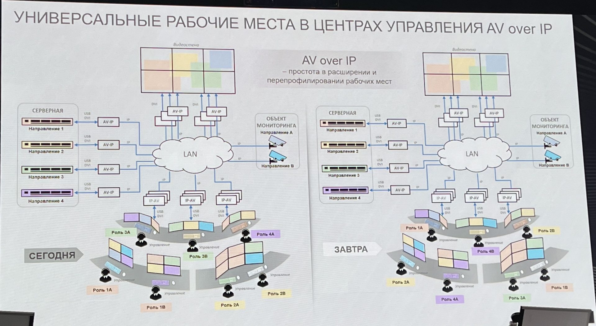 Вторая отраслевая тенденция – переход от сложных аппаратных монолитов к архитектуре Software First. По словам специалистов, будущее центров управления – за программно-определяемыми средами. Громоздкие матричные коммутаторы уступили место системам оркестрации на базе AV/KVM-over-IP, что позволяет использовать стандартные ИТ-сети и существующее оборудование.
