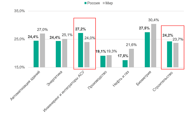 В ряде отраслей в России доля промышленных компьютеров, на которых были заблокированы вредоносные объекты, была выше, чем в среднем по миру, например, в строительстве (24,2% в РФ против 23,7% по миру), в инжиниринге и у интеграторов АСУ (27,2% против 24%). Злоумышленники активно атакуют интеграторов, доверенных партнеров и подрядчиков, и в России этот тренд особенно виден.
