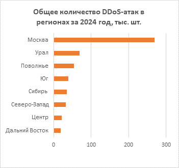 Что касается географического распределения, то по-прежнему большая часть DDoS приходится на Москву. Второе место занял Приволжский федеральный округ — всего за год в этом регионе зафиксировано и отражено 53,1 тыс. атак. Вектор переместился в Поволжье из-за расположения в округе большого количества промышленных предприятий, в том числе оборонной отрасли, которые интересуют хакеров.