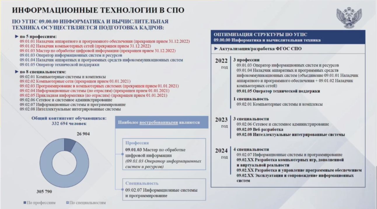 В России реализуется федеральный проект «Цифровая экономика». С 2025 г. будет запущен новый национальный проект «Экономика данных». Цифры приема кратно выросли за последние годы. Рабочей группе, созданной на платформе АНО «Цифровая экономика», удалось доказать, что помимо 23 классических ИТ-специальностей остальные направления обучения требуют наращивания компетенций в области информационных технологий.
