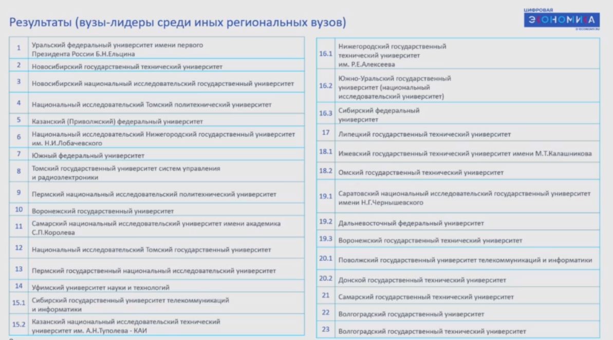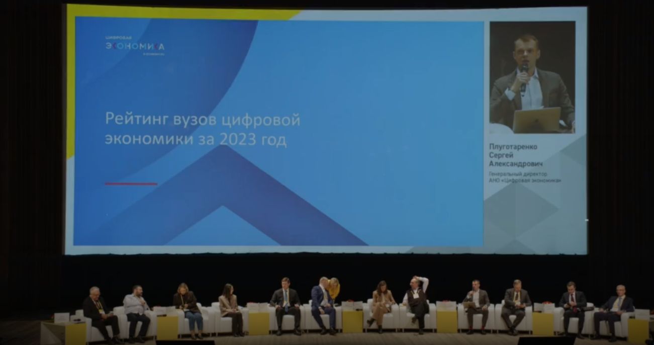 На пленарном заседании конференции был представлен рейтинг вузов цифровой экономики за 2023 г. В него включены российские высшие учебные заведения, осуществляющие обучение по ИТ-специальностям за счет федерального бюджета на уровне бакалавриата и специалитета по направлениям подготовки и специальностям в сфере ИТ, определяемым Минцифры России.