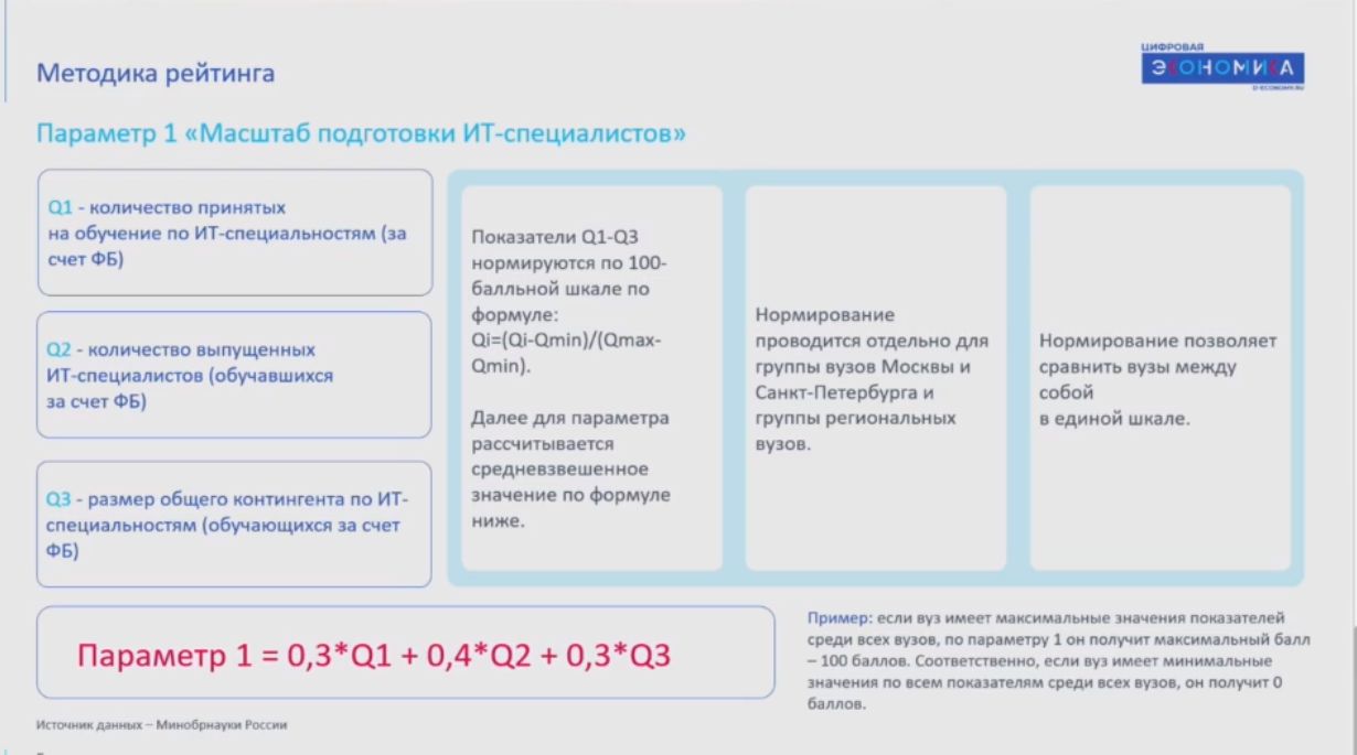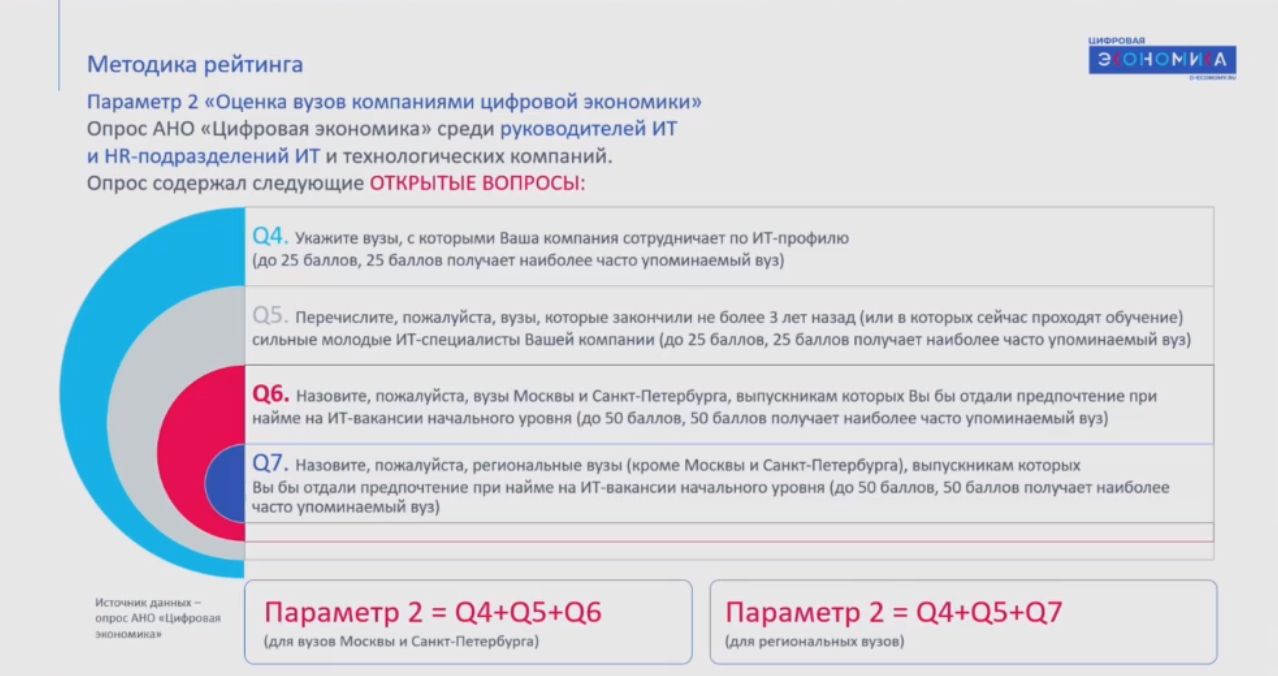 Параметры определения места в рейтинге – масштаб подготовки ИТ-специалистов и оценка вузов компаниями цифровой экономики, востребованность выпускников. Компаниям-работодателям были заданы три вопроса: с какими вузами они сотрудничают в части подготовки ИТ-кадров, какие вузы за последние три года оканчивали сильные молодые ИТ-специалисты, выпускникам каких вузов они отдают предпочтение при найме на ИТ-вакансии начального уровня.