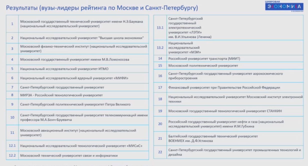 В итоговый рейтинг цифровой экономики среди вузов двух российских столиц вошли 24 учебных заведения. На первом месте в этой группе – МГТУ им. Н. Э. Баумана. В рейтинге региональных вузов 30 лидеров, на первой позиции Уральский федеральный университет имени Б. Н. Ельцина.