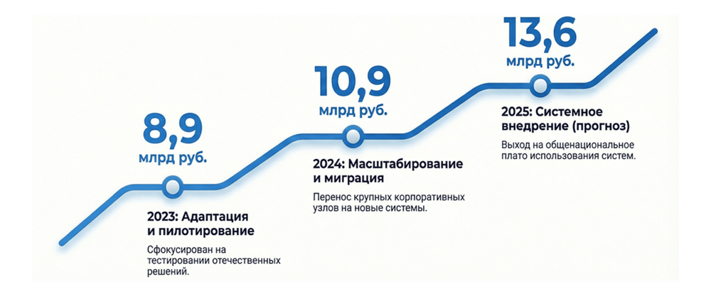 Согласно данным J’son & Partners Consulting, сегмент ВКС on-premise в России демонстрирует устойчивый рост. По предварительной оценке, объем рынка в 2025 году составил 13,6 млрд рублей, а к 2028 году достигнет 24,6 млрд рублей. Среднегодовой темп роста (CAGR) оценивается в 22,5%, что существенно опережает средние показатели ИТ-сектора.