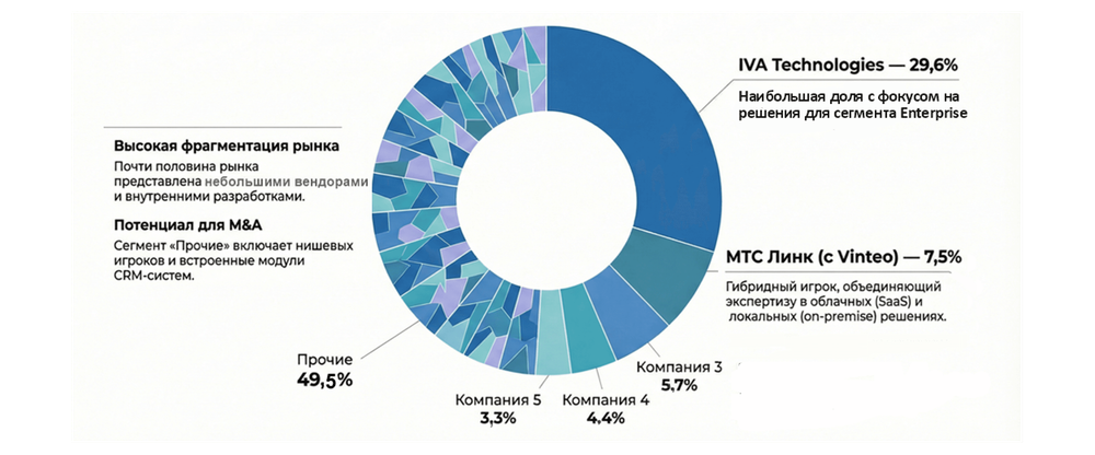 Наибольшую долю рынка в сегменте занимает компания IVA Technologies — вендор, который исторически специализируется на серверных решениях (доля рынка — 29,6%). При этом на втором месте по доле рынка оказался исторически облачный вендор МТС Линк: приобретение им вендора Vinteo (с долей рынка порядка 7,5%) отражает тенденцию к расширению продуктовых предложений со стороны игроков, традиционно ориентированных на облачные модели. Переход решений, изначально разработанных для on-premise, в облачную среду, как правило, осуществляется медленнее.