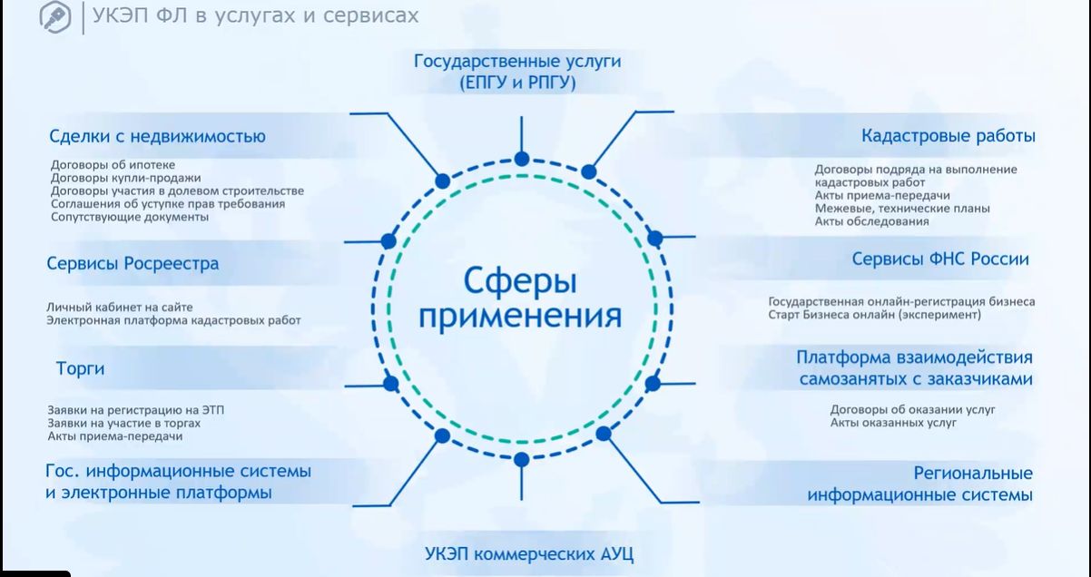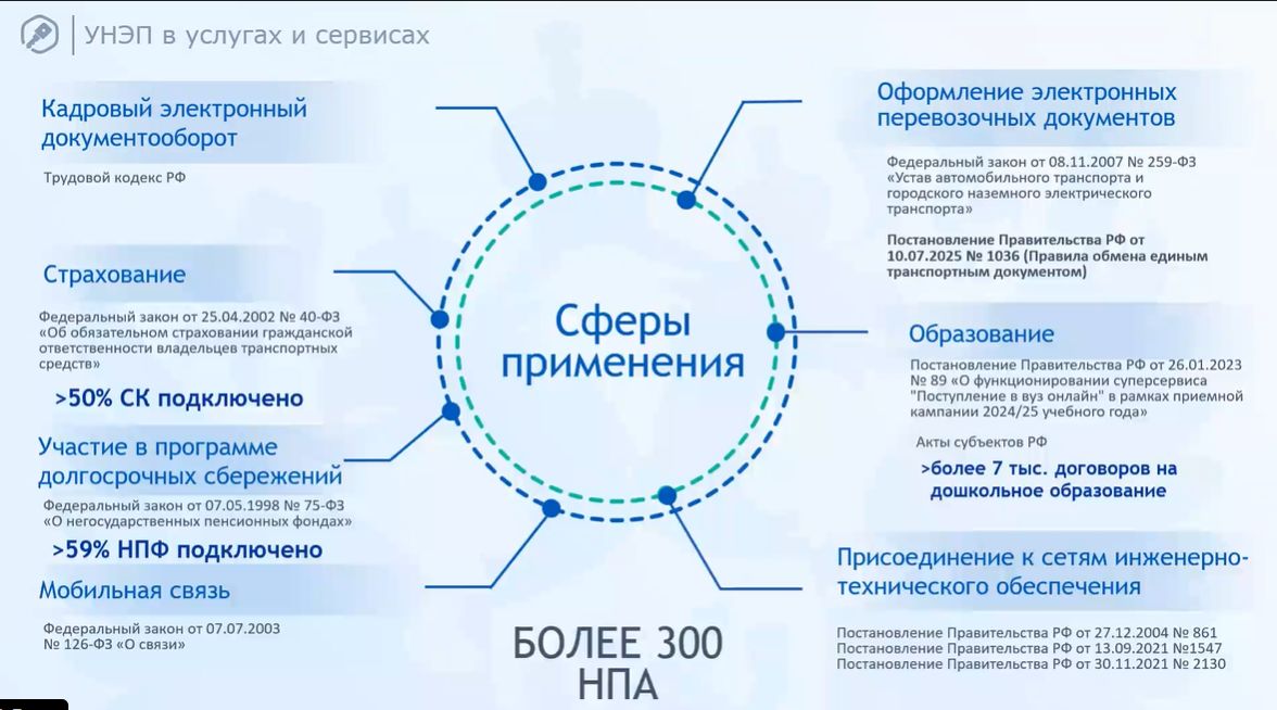 К сферам применения УНЭП относятся кадровый электронный документооборот, мобильная связь, оформление электронных перевозочных документов, образование, страхование.