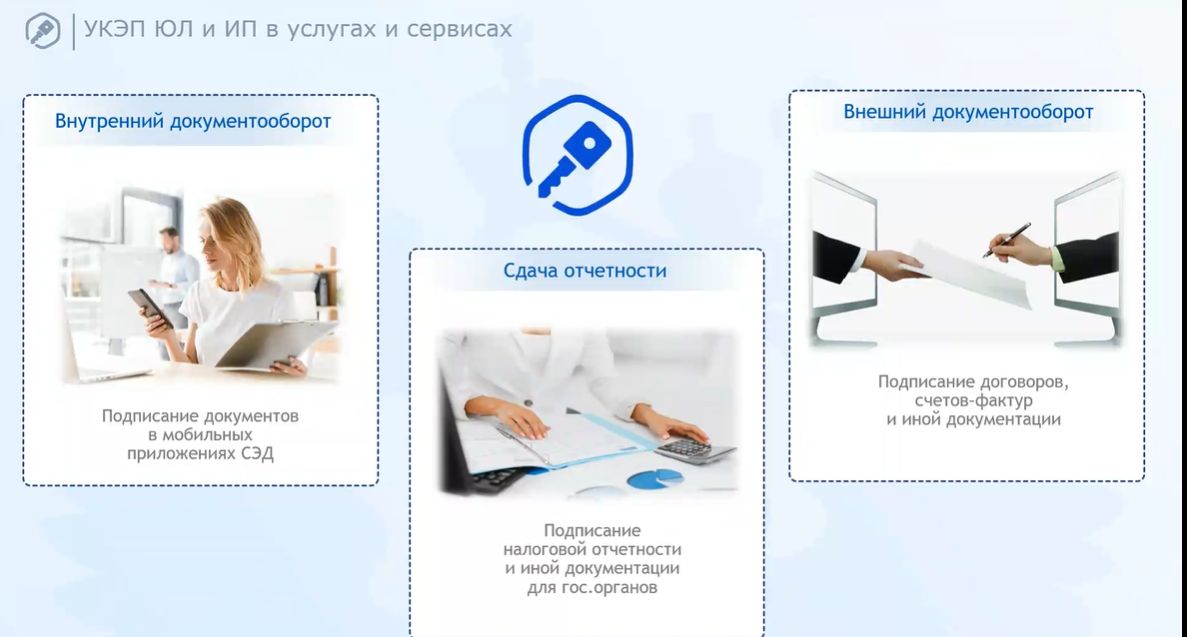 В сфере налоговой отчетности готовится пилотный проект. Подписанию налоговых отчетов с помощью данного инструмента ничего не мешает, технически можно обеспечить интеграцию с технологией. Реализация пилотного проекта, как ожидается, стимулирует операторов налоговой отчетности подключаться к мобильному приложению «Госключ».
