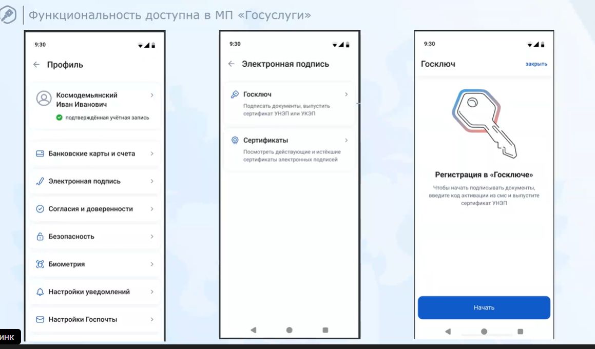 На вебинаре, посвященном технологии мобильной электронной подписи, эксперт рассказал о новых ее возможностях для юридических лиц и индивидуальных предпринимателей с применением «Госключа». Инструмент можно использовать, в частности, при подписании документов, отчетности, получении государственных услуг. Развиваются способы интеграции с мобильным приложением «Госключ», которое значительно упрощает оборот документов. С 6 августа этого года его функциональность встроена в мобильное приложение «Госуслуги».