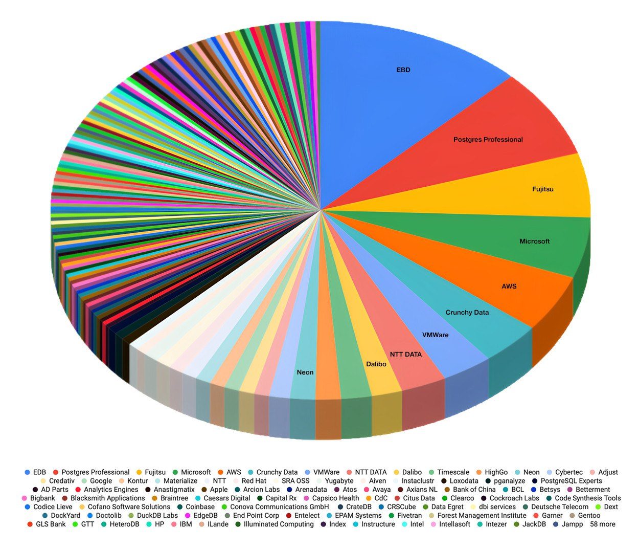 Большой вклад в развитие PostgreSQL вносят российские разработчики. Так, второе место в международном рейтинге контрибьюторов системы по версии EDB, занял российский СУБД-разработчик Postgres Professional, обогнав Fujitsu, Microsoft, Amazon, Google, Apple. Среди других российских компаний в рейтинге – «СКБ Контур» (17-е место) и Arenadata (33-е место).