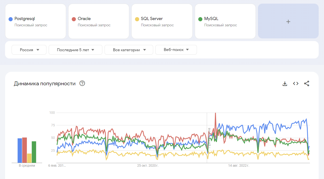 Согласно аналитике Google Trends за 2023 год, популярность PostgreSQL в России в прошлом году оказалась на 68% выше, чем Oracle, на 75% – MySQL и на 320% – MS SQL Server. Перелом в пользу PostgreSQL случился вслед за уходом западных вендоров из России, в марте 2022 года: