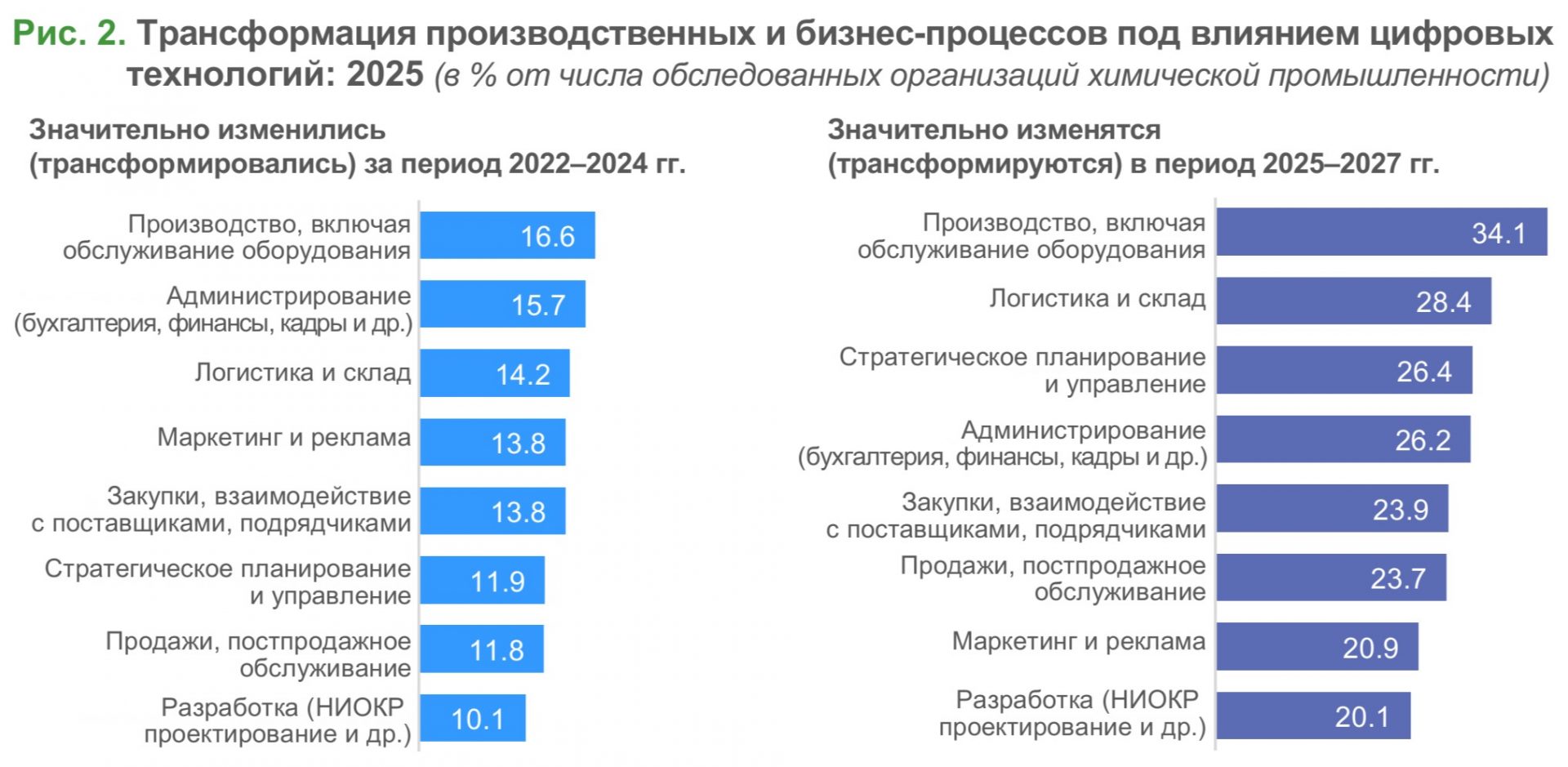В период 2022–2024 гг. влияние цифровых технологий на бизнес-процессы организаций химической промышленности было умеренным: изменения затронули преимущественно производство (17% организаций) и администрирование (16%) (рис. 2).