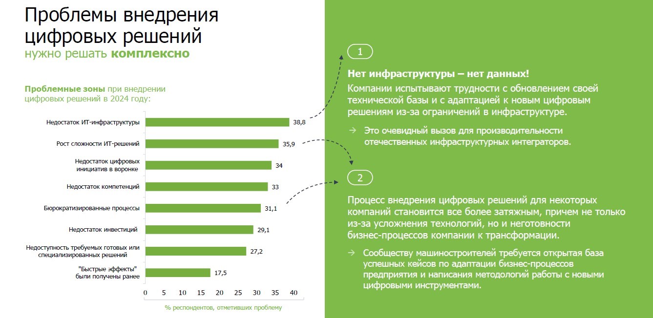По словам Сергея Емельченкова, «неготовность технической базы к цифровизации и ограничения ИТ-инфраструктуры, не позволяющие реализовать цифровые решения, — главные препятствия на пути предприятий к управлению на основе данных. В этом плане есть большое поле для работы отечественных инфраструктурных интеграторов. Также среди значимых вызовов — неготовность бизнес-процессов предприятий к цифровой трансформации и недостаток компетенций. Здесь могут помочь методические рекомендации по внедрению и работе с различными цифровыми инструментами на основе успешного опыта и создание центров компетенций в рамках крупных производств и холдингов, которые возьмут на себя подготовку кадров для инициирования, планирования и реализации цифровых инициатив».