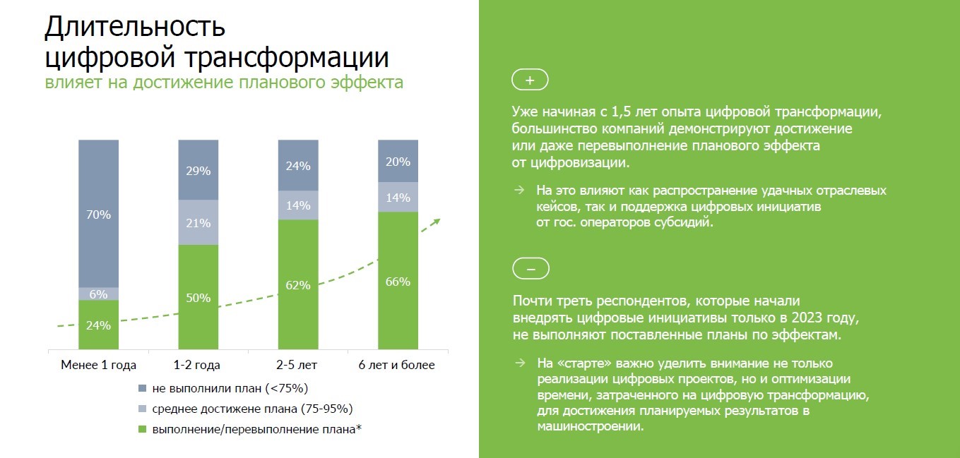 Исследование выявило корреляцию между достижением запланированных эффектов от цифровизации с опытом компаний. То есть более 70% предприятий, приступивших к цифровой трансформации лишь год назад, не выполняют планы по эффектам от «цифры», тогда как большинство компаний с опытом, приступивших к цифровизации три-шесть лет назад, демонстрируют достижение поставленных целей или получают эффекты выше ожидаемого.