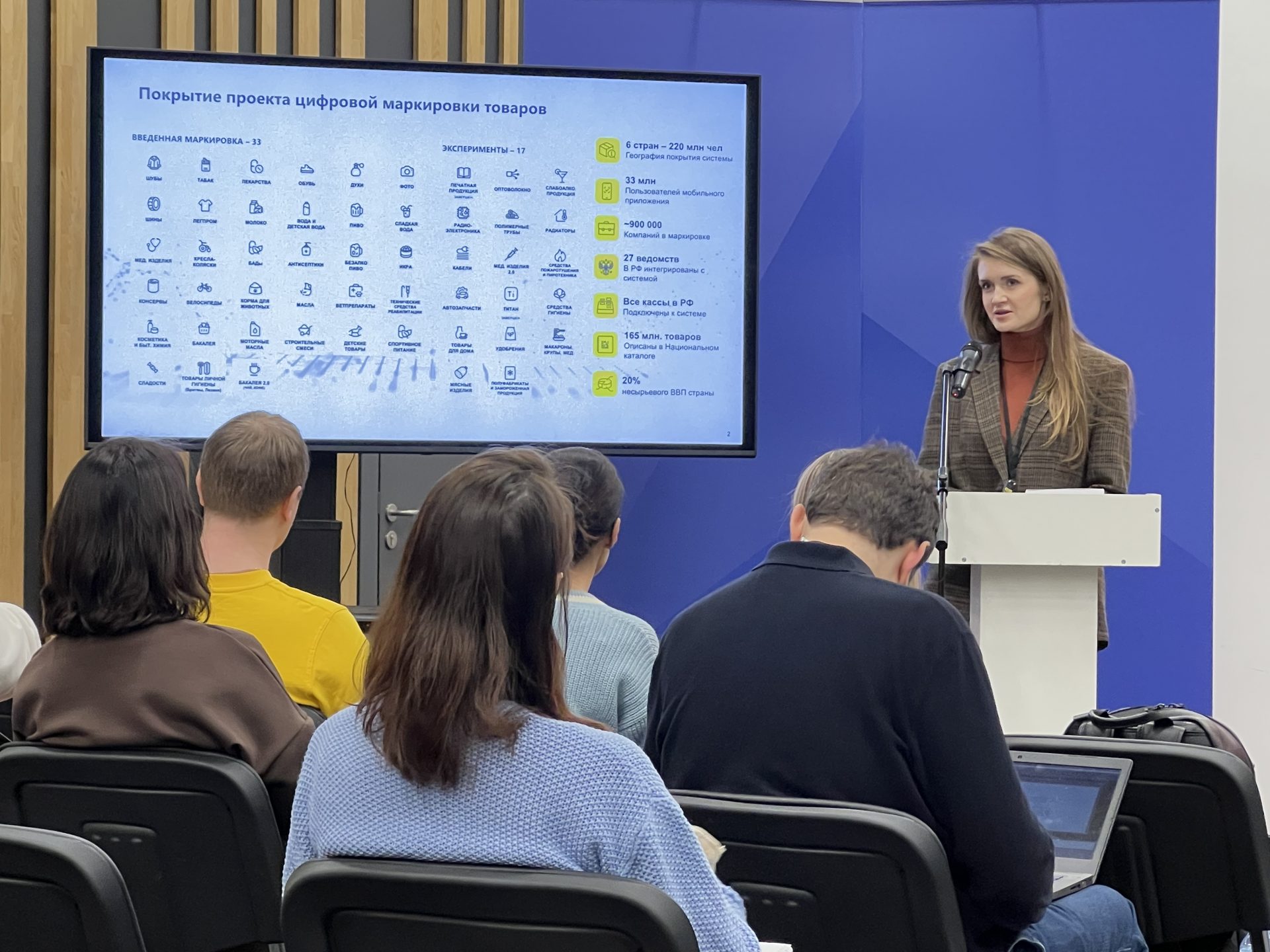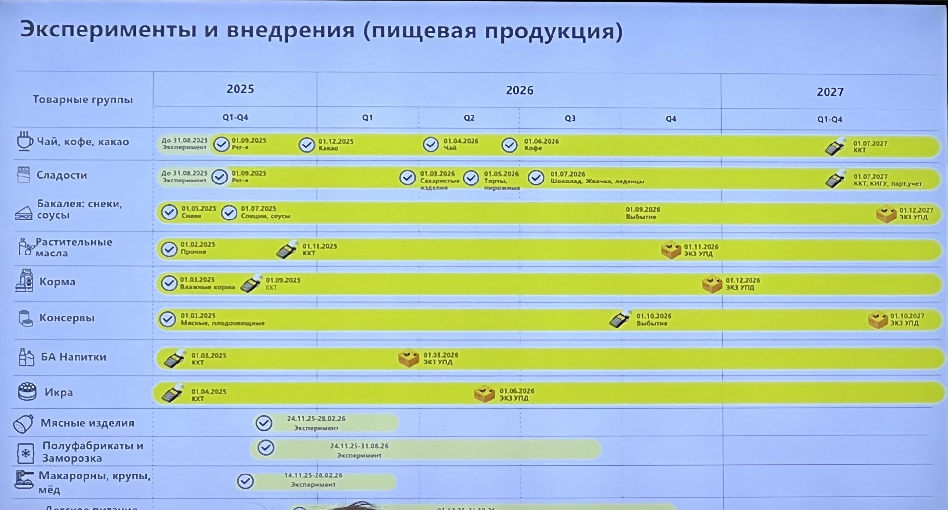 Руководитель управления безакцизной пищевой продукции Центра развития перспективных технологий (ЦРПТ) Юлия Кузьмина представила дорожную карту реализации этого проекта. К настоящему времени введена маркировка 33 групп товаров, еще 17 категорий находятся на этапе эксперимента. В систему маркировки интегрированы 27 российских ведомств. У каждого производителя, импортера продукции есть возможность на безвозмездной основе протестировать систему (ввести код, проверить разные технологии, выполнить иные операции, необходимые для обеспечения жизненного цикла продукта в рамках срока его годности).
