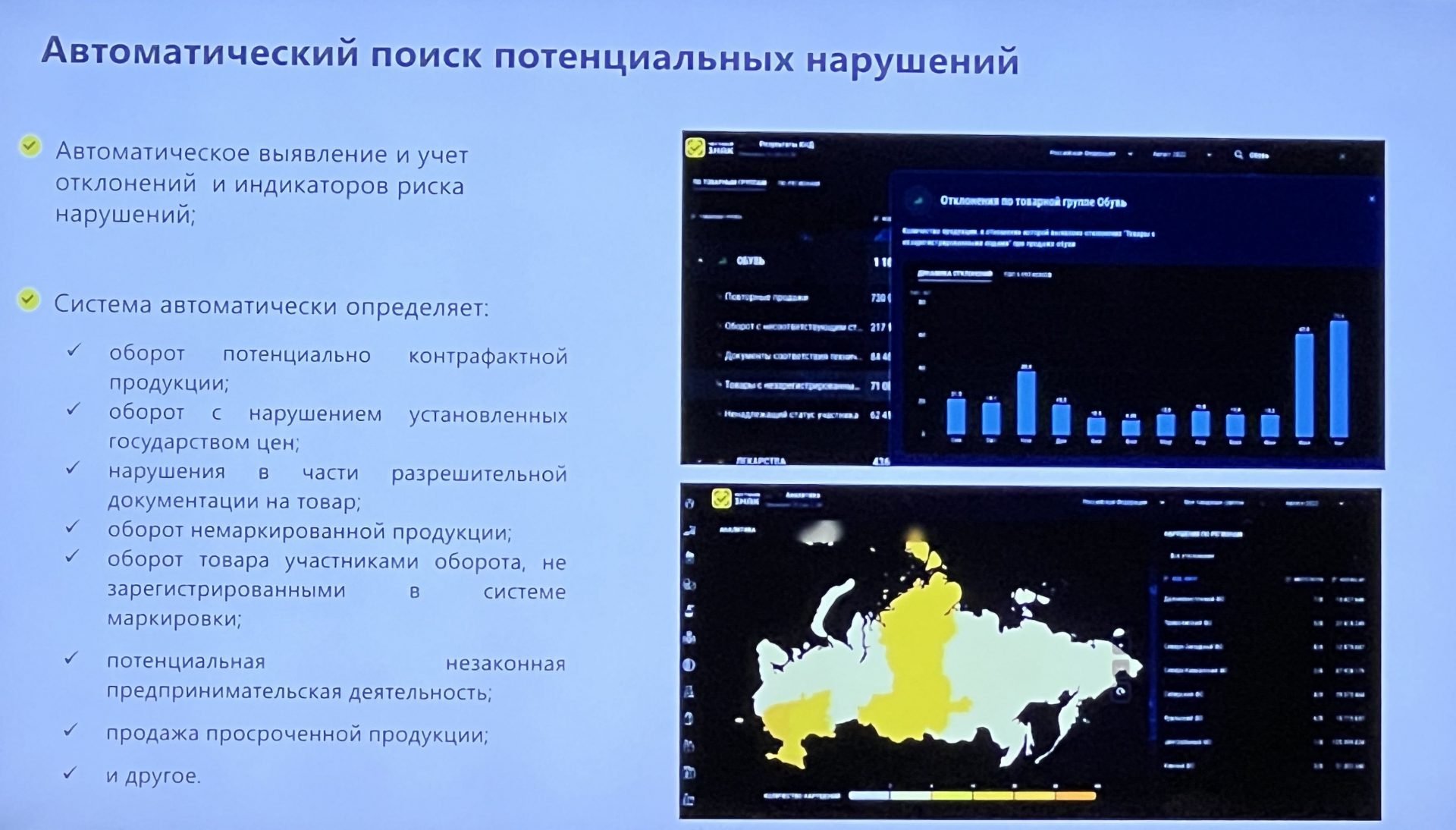 Система маркировки автоматически определяет оборот потенциально контрафактной и немаркированной продукции, оборот с нарушением установленных государством цен, нарушения в части разрешительной документации на товар, оборот товара участниками, не зарегистрированными в системе, продажу просроченной продукции и т. д.