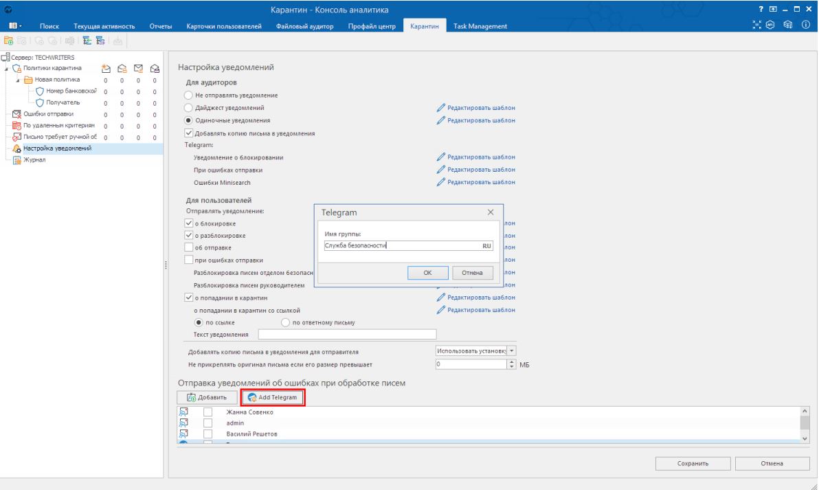 «СёрчИнформ КИБ» по заранее настроенным правилам останавливает отправку писем с подозрительным содержанием, помещает их в карантин и затем оповещает об этом ИБ-специалиста. Ранее настроить отправку уведомлений специалист мог на email-адрес, теперь в системе доступна отправка сообщений в Telegram.